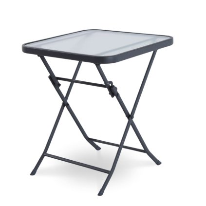 Kompakt, összecsukható kerti asztal fém vázzal és üveg lappal, 5 év garanciával.