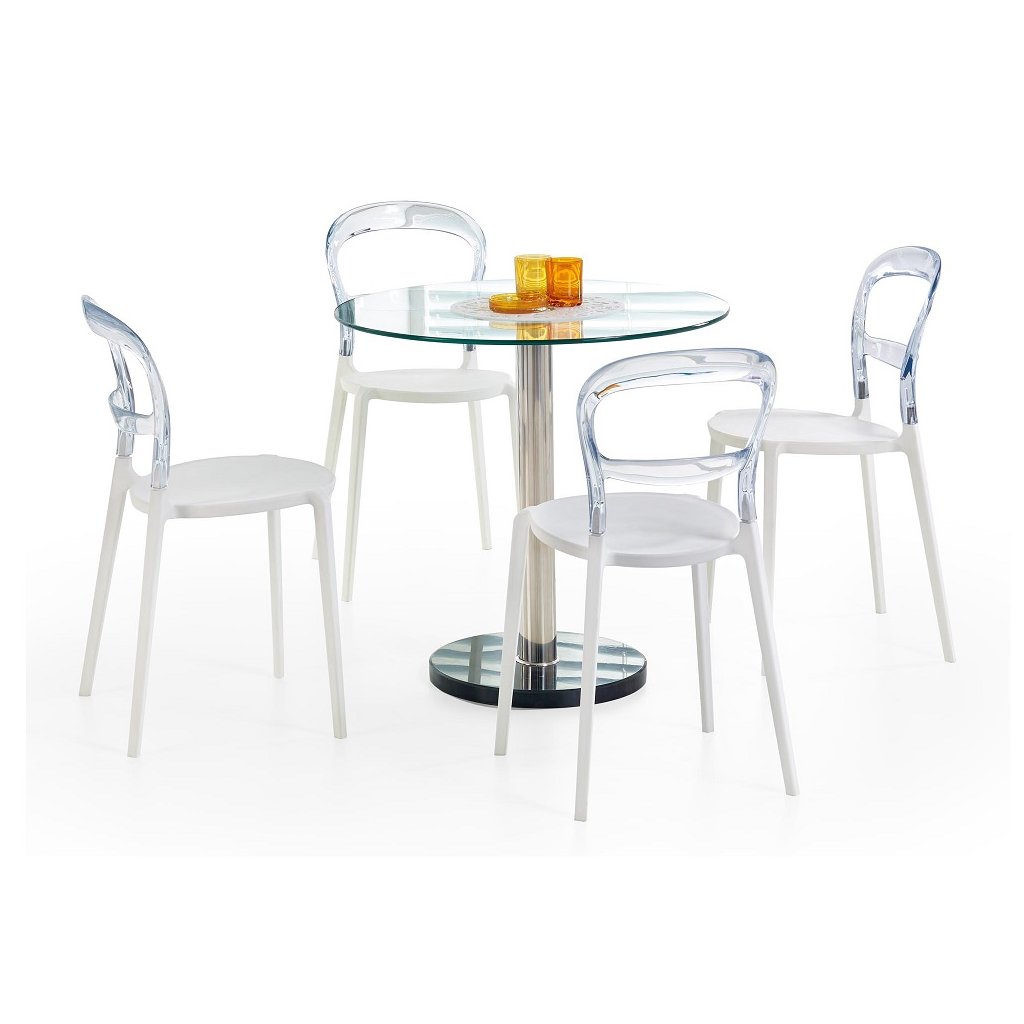 Az asztal fémszerkezetű, márvány alappal, amely meghosszabbodik, és így kiváló stabilitást biztosít a az egész asztalot. Az asztal legnagyobb előnye azonban a kör alakú üveglap. Az asztalnál 4 személy kényelmesen ülhet.