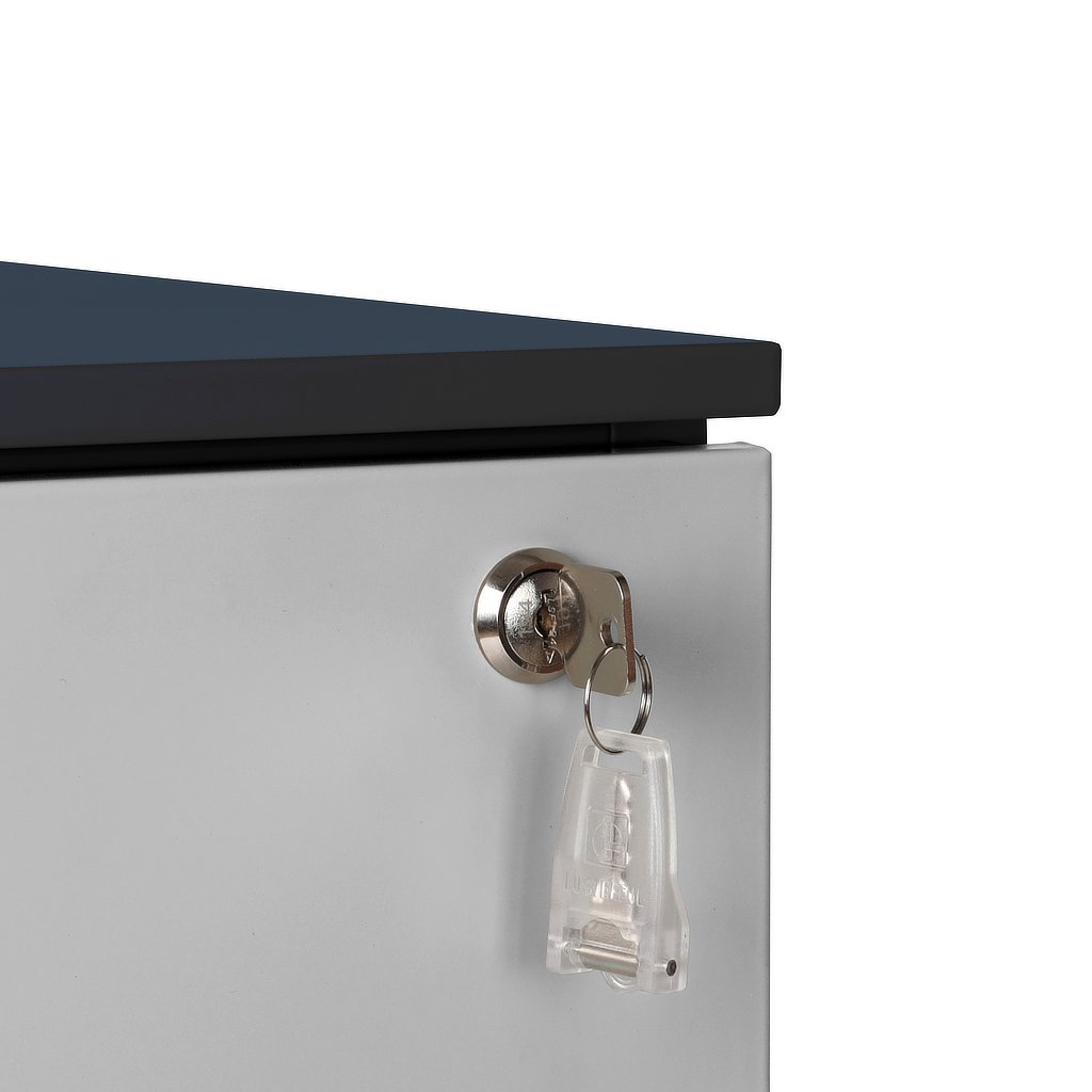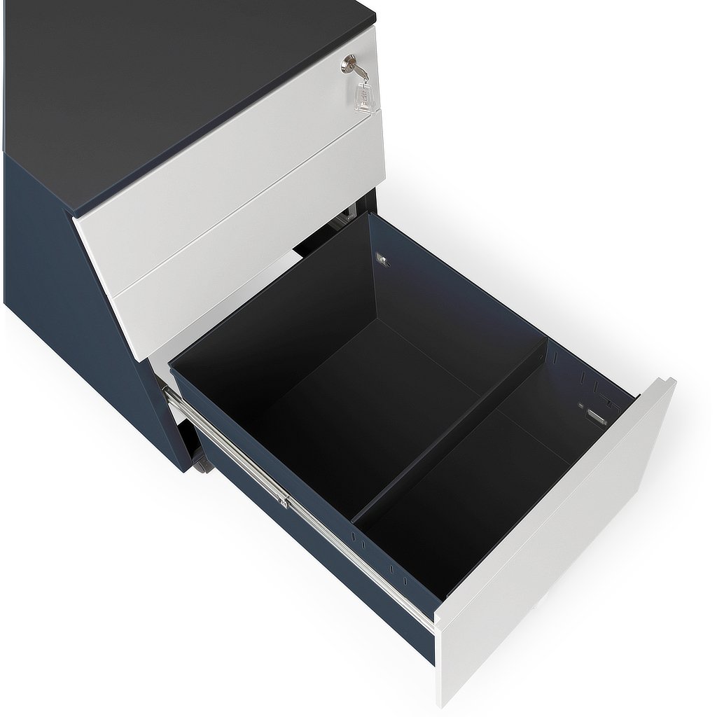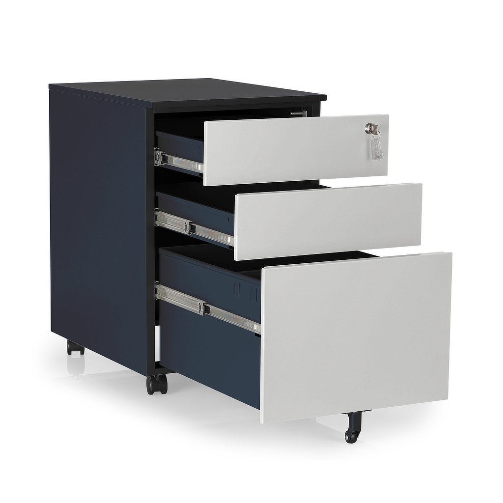 A három fiók többféle tárolási igényt szolgál ki, miközben a fiókok teljes kihúzhatósága (100%) megkönnyíti a hozzáférést. A központi, hengeres zárral felszerelt konténer biztosítja az értéktárgyak biztonságát. A fiókok egyenként akár 50 kg terhelést is elbírnak, így nehezebb dokumentumokat vagy eszközöket is tárolhat benne probléma nélkül.