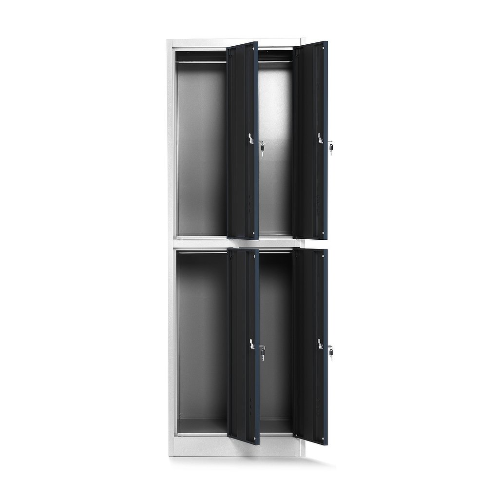 Ez a fém öltözőszekrény kiváló választás mindazok számára, akik megbízható és tartós tároló megoldást keresnek munkahelyi vagy otthoni használatra. A masszív fémváznak és a speciális fémlemez vastagságnak köszönhetően hosszú élettartamot garantál, melyet egy 20 éves garancia is megerősít. A szekrény 4 külön rekeszre van osztva, így egyszerre több személy vagy többféle használati tárgy is kényelmesen elhelyezhető benne.