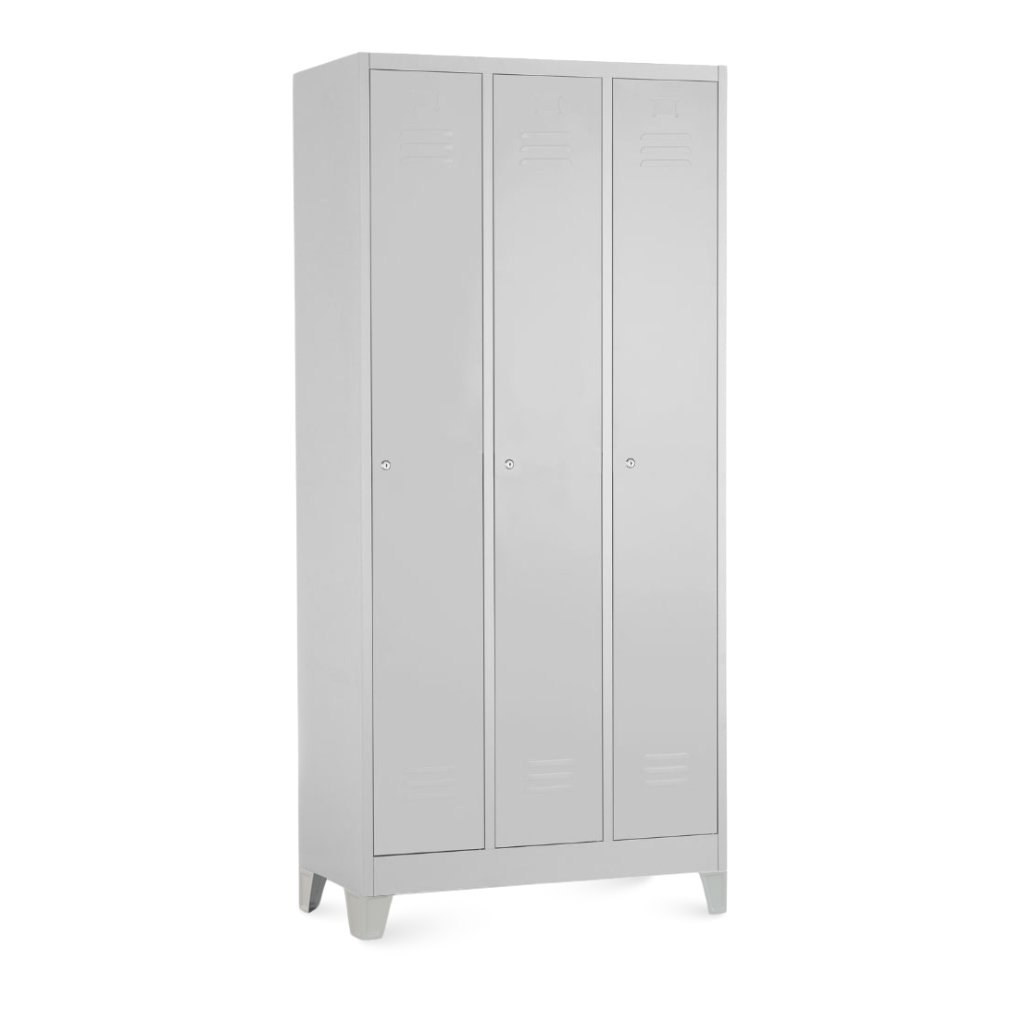 Fém szekrény - 3 rekeszes, 90 x 50 x 190 cm, fix lábakkal, hengerzár, világos szürke - ral 7035