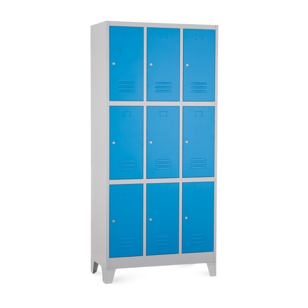 Fém szekrény - 9 doboz, 90 x 45 x 195 cm, fix lábakkal, hengerzár, kék - ral 5012