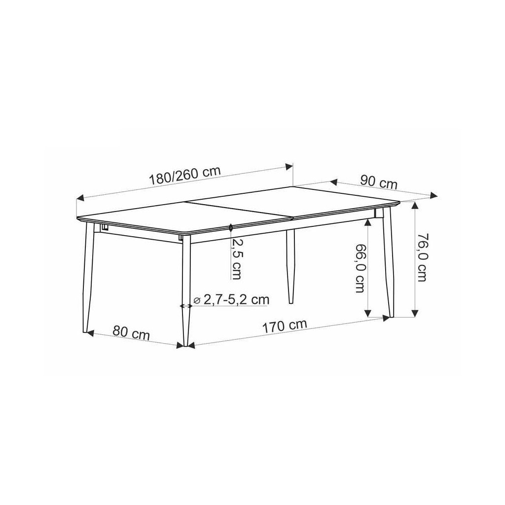 Ez az étkezőasztal hosszúsága alaphelyzetben 180 cm, de igény esetén könnyedén kinyújtható egészen 260 cm-ig, így akár 10 fő számára is kényelmes ülőhelyet biztosít. A 5 év garancia pedig garantálja a megbízható használatot éveken át.