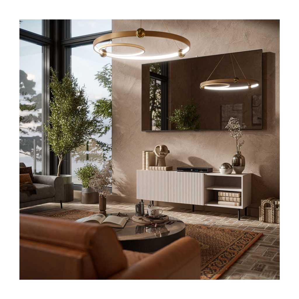 Ez a TV állvány könnyen beilleszthető különféle enteriőrökbe, és egyaránt támogatja a funkcionális és esztétikus környezet kialakítását. Szélessége 150 cm, mélysége 40 cm, magassága pedig 54 cm, így elegendő helyet biztosít a legtöbb televízió és kiegészítő számára.