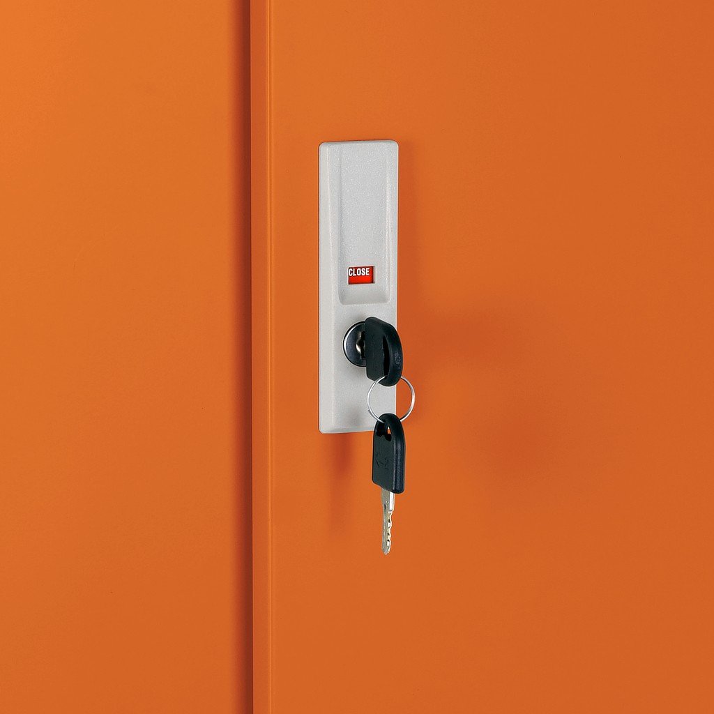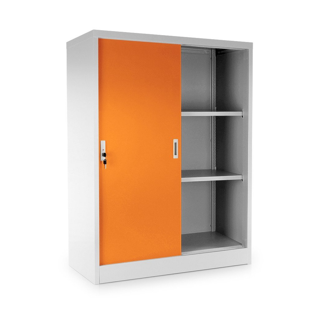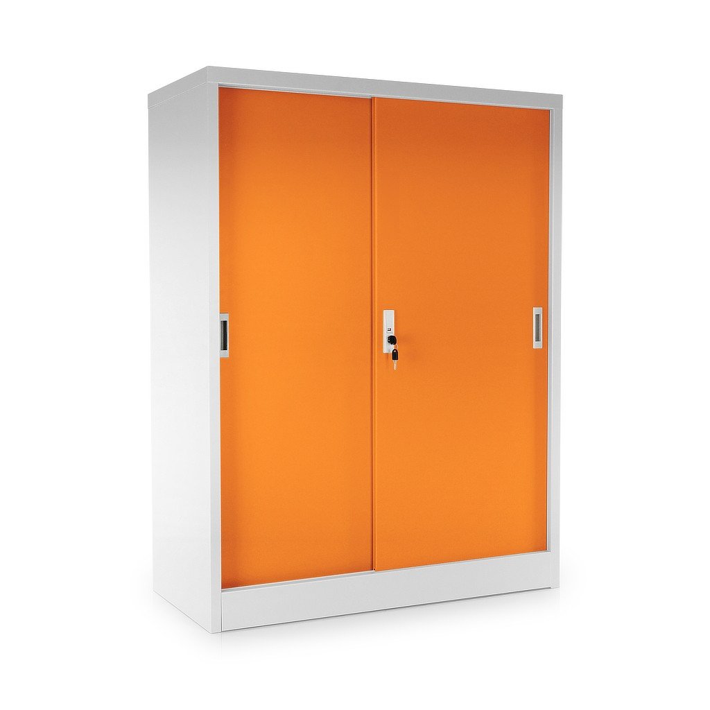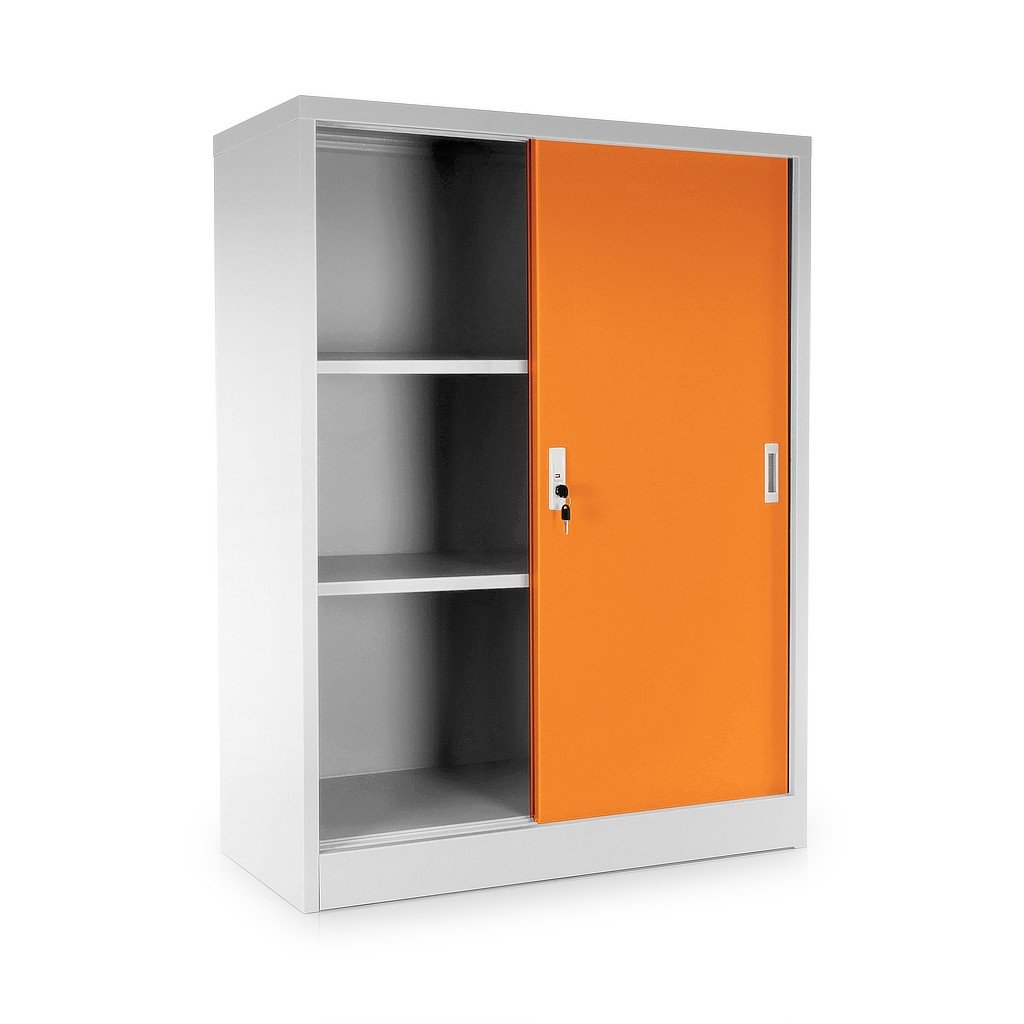 Közepes univerzális fém szekrény tolóajtókkal 90 x 40 x 120 cm, hengerzár, narancs - ral 2004