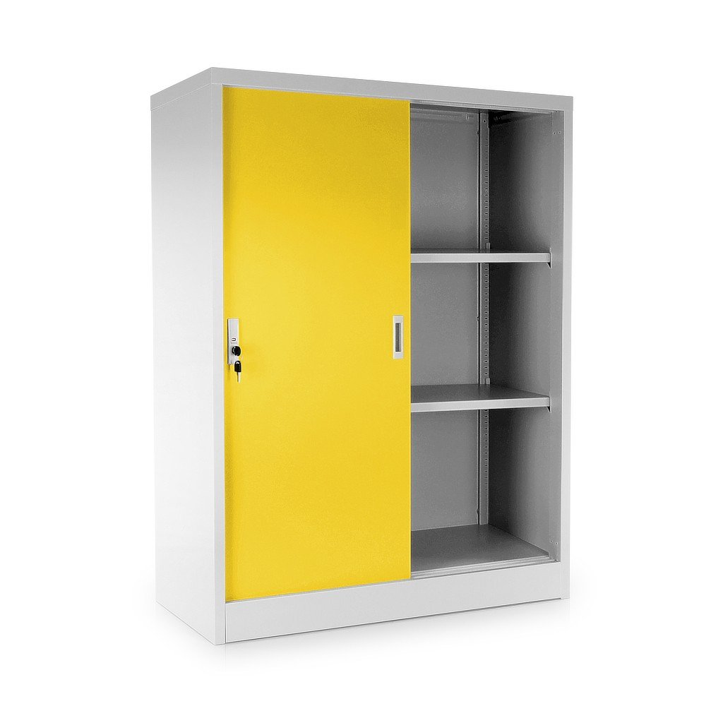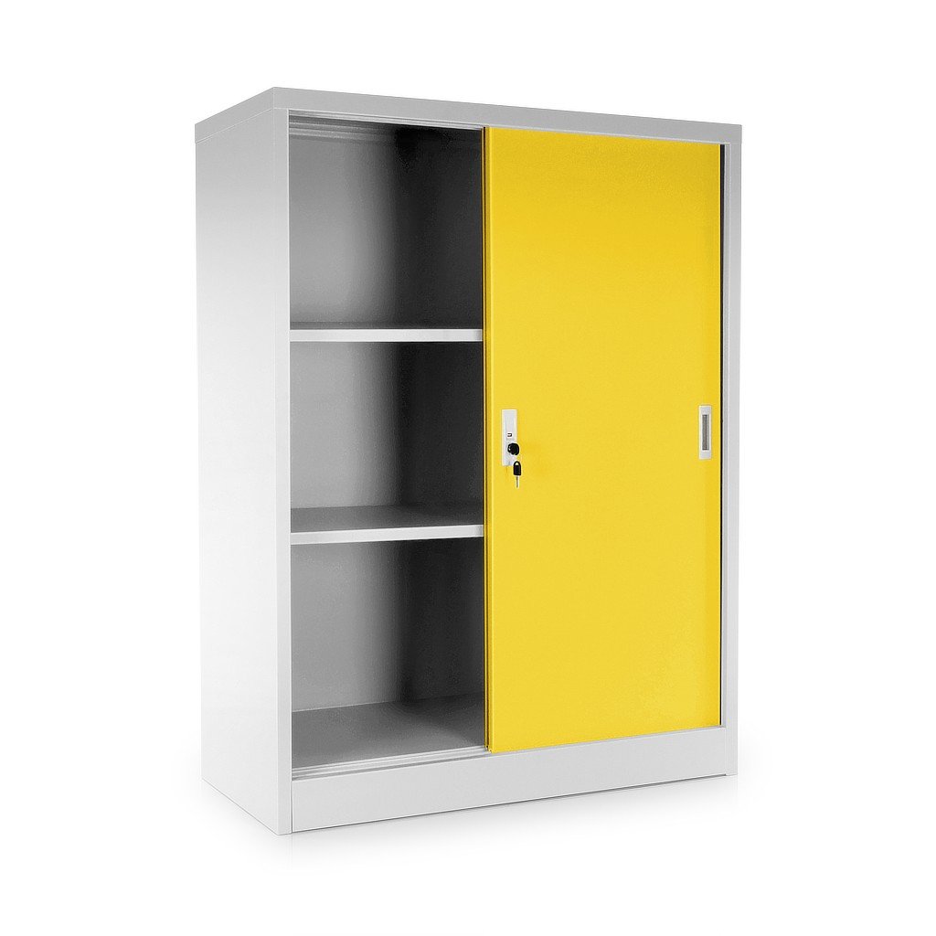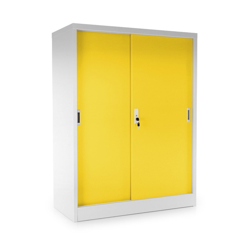 Közepes univerzális fém szekrény tolóajtókkal 90 x 40 x 120 cm, hengerzár, sárga - ral 1023