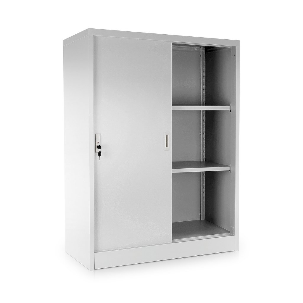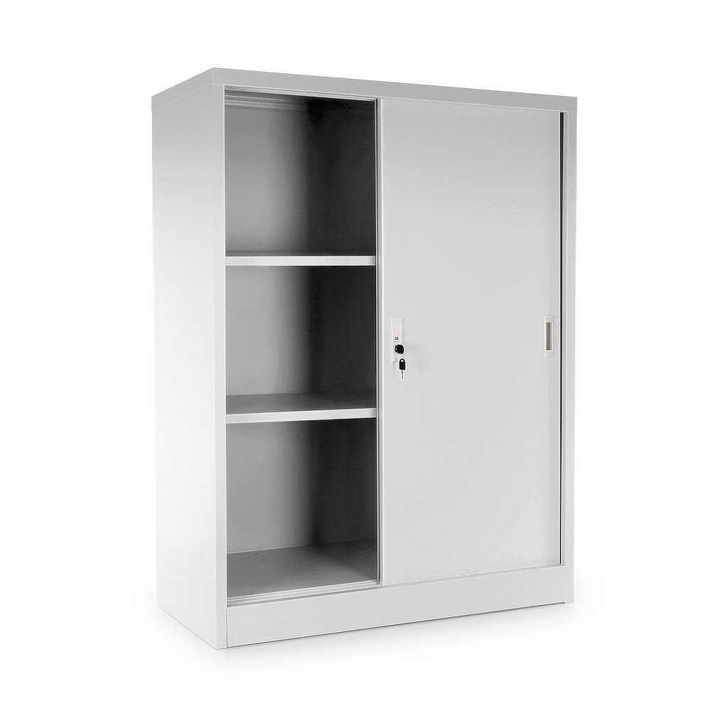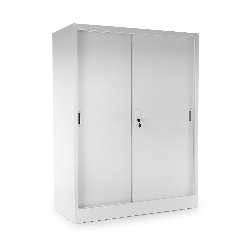 Közepes univerzális fém szekrény tolóajtókkal 90 x 40 x 120 cm, hengerzár, szürke - ral 7035