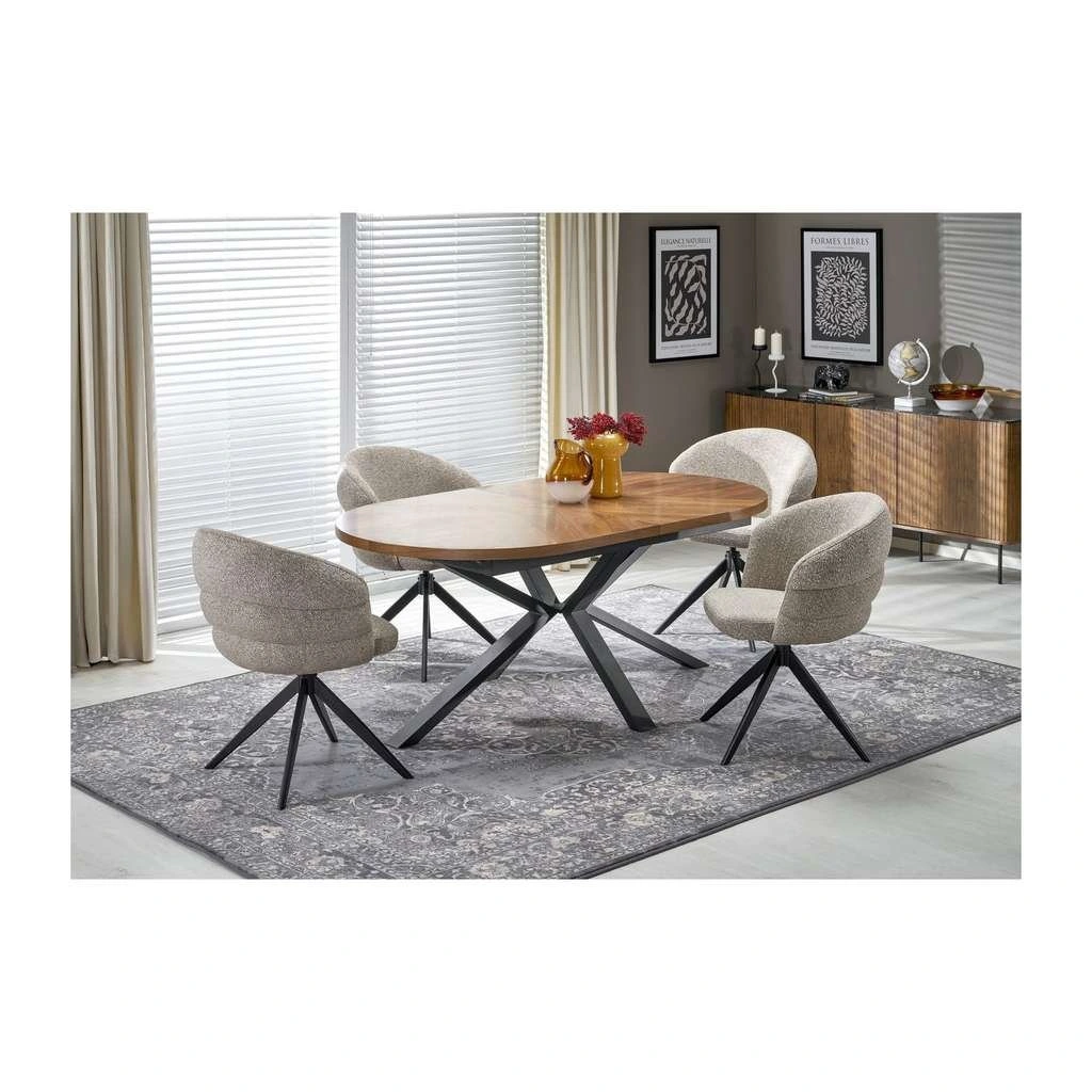 A Ligia étkezőasztal elegáns és funkcionális megoldás mindazok számára, akik tágas és stílusos bútort keresnek otthonukba vagy étkezőjükbe. Az ellipszis alakú fa asztallap természetes és meleg hatást kelt, miközben a fém alap modern megjelenést és stabilitást biztosít.
