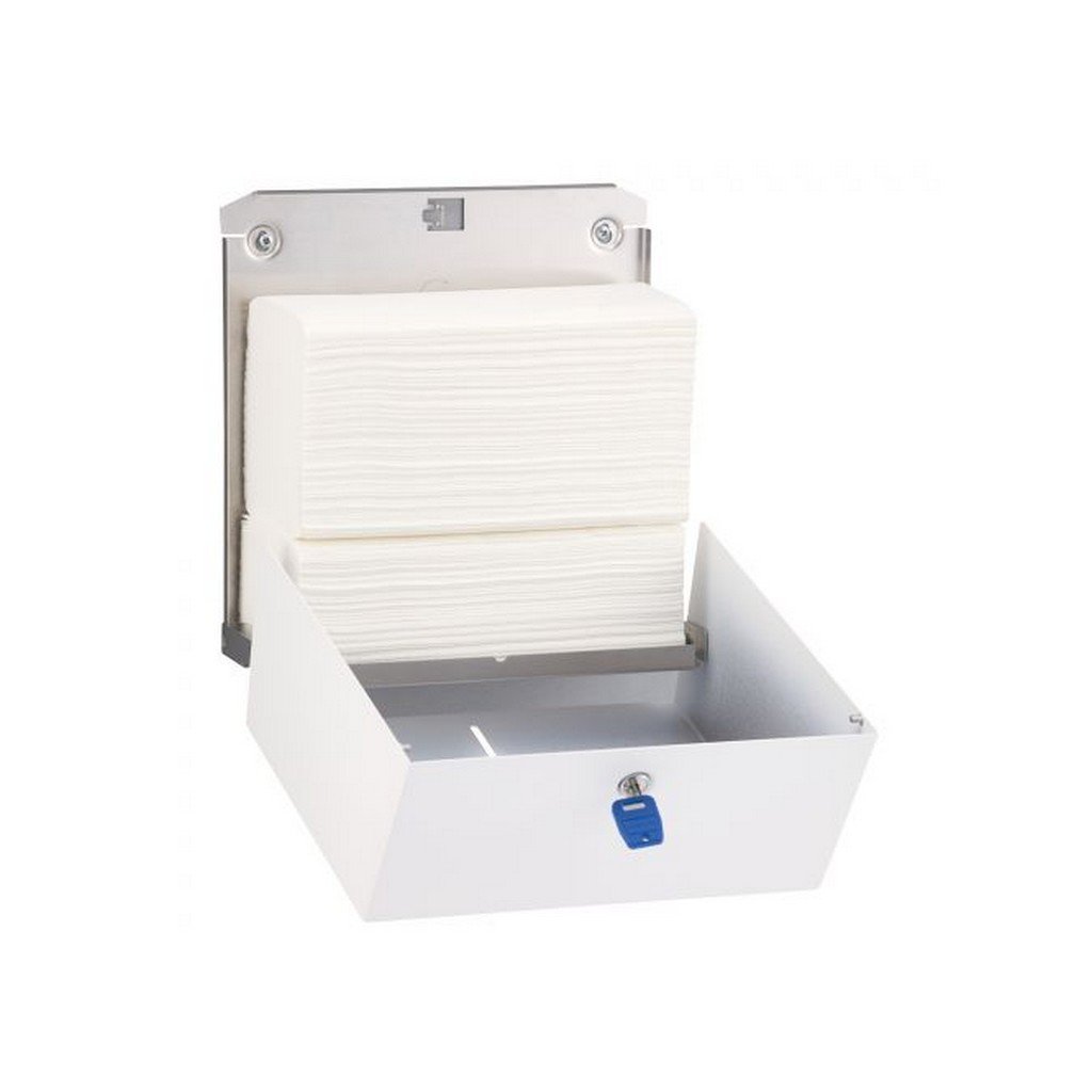 A papírtörlő-adagoló festett fémből készült szerkezete, és van benne egy zárható hely a törölközők számára . Kínáljuk 3 színben. Fehér színben, valamint matt vagy fényes rozsdamentes acélban.