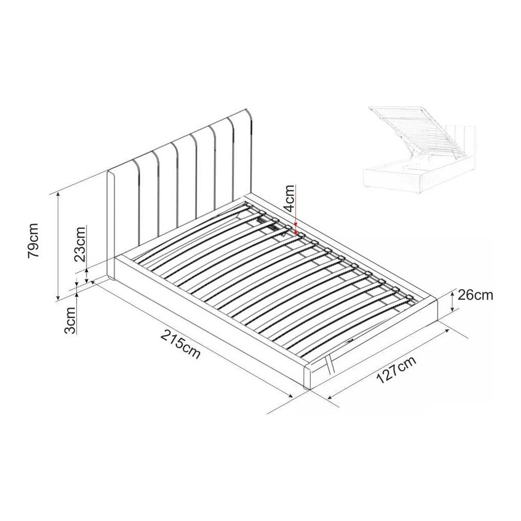 - Méretek: 120 x 200 cm fekvőfelület, 215 cm hossz, 127 cm mélység