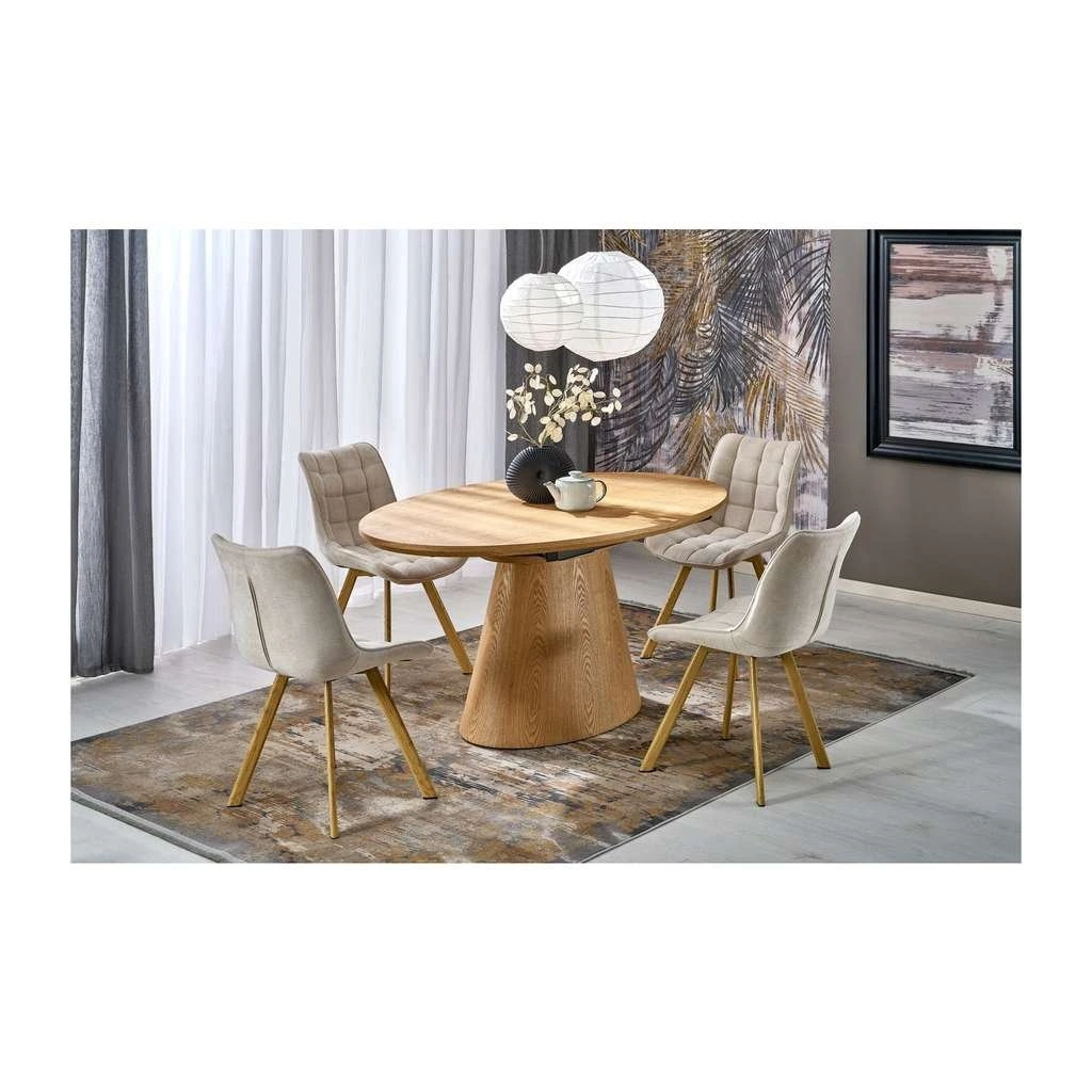 A Morfi étkezőasztal egy időtálló és természetes megjelenésű bútor, amely kiválóan illik étkező vagy nappali térbe egyaránt. Az ellipszis formájú, fa asztallap és a stabil fa alap harmonikus összhangot alkot, miközben a bővíthetőségnek köszönhetően akár 7 személy kényelmes étkezését is lehetővé teszi.