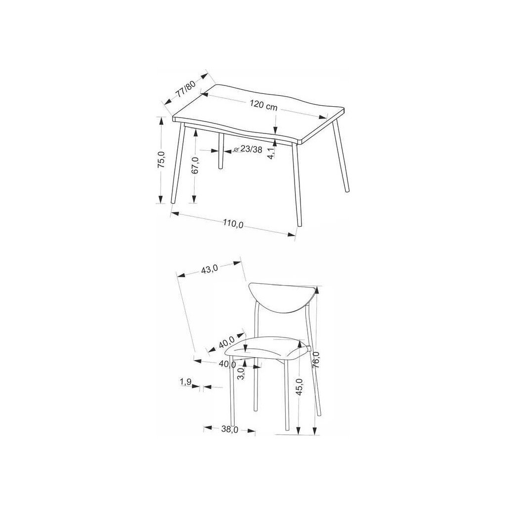Az étkezőgarnitúra méretei praktikusan illeszkednek kisebb és közepes méretű terekbe, az asztal 120 cm hosszú, 80 cm mély, és 75 cm magas, míg a székek ergonomikus paraméterei garantálják a kényelmet hosszú használat során is.