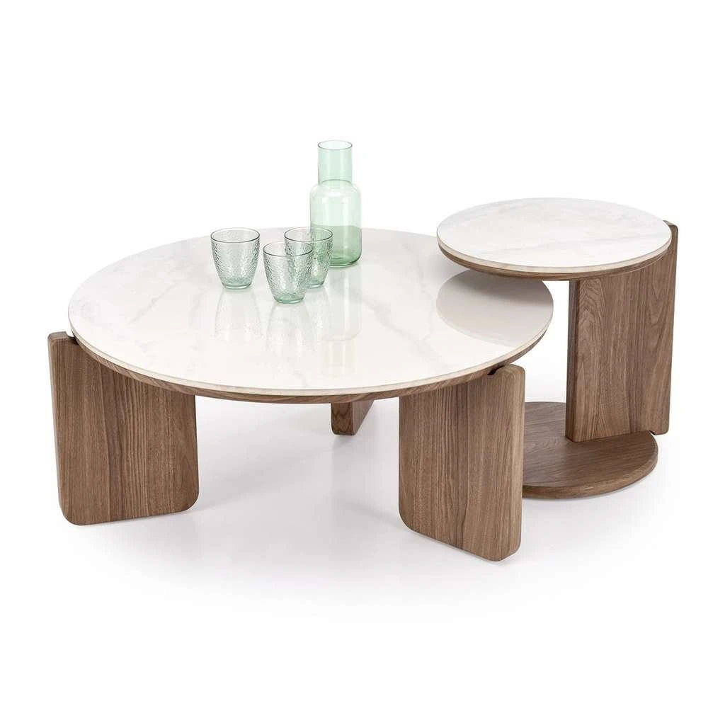 A két különböző méretű asztal praktikus megoldást kínál, amely rugalmasan használható, akár együtt, akár külön-külön. A kerek formájú asztallap lágy, barátságos megjelenést kölcsönöz, miközben a masszív szerkezet stabilitást nyújt a mindennapi használathoz.