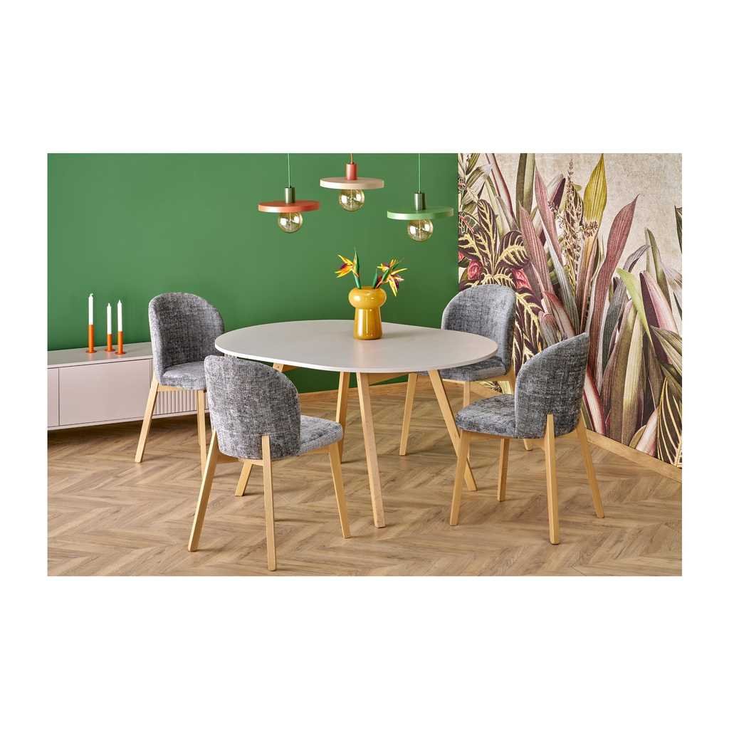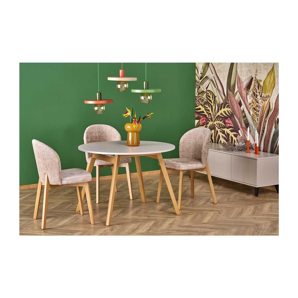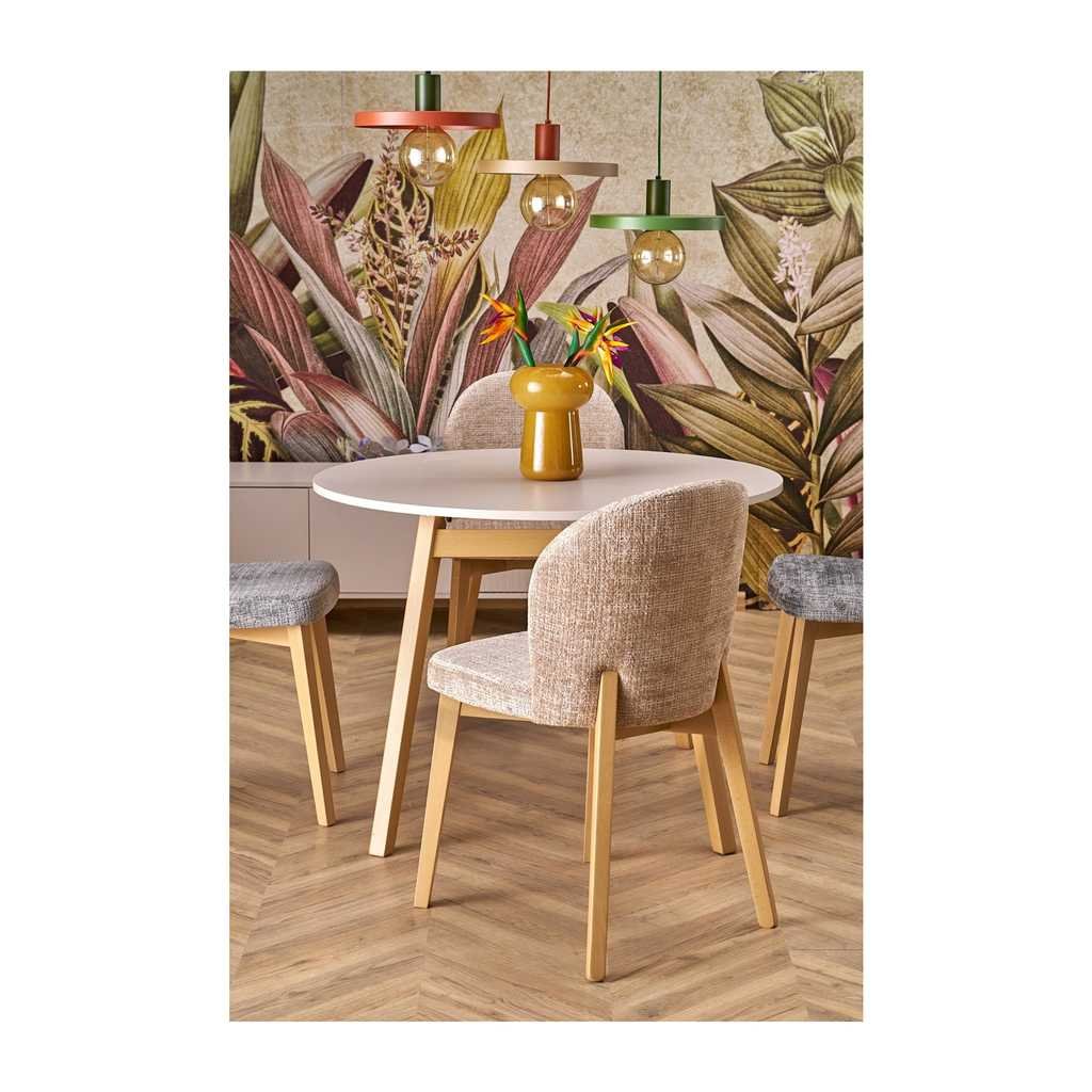 A Ruben étkezőasztal időtlen dizájnt és funkcionalitást kínál otthonodba. Ez a kör alakú, fa anyagú asztal tökéletes választás a mindennapi étkezésekhez, de alkalmas nagyobb családi vagy baráti összejövetelekhez is, köszönhetően bővíthető kialakításának. Alapmérete kompakt, így kisebb helyiségekbe is ideális, de könnyedén növelhető, hogy akár 6 személy kényelmesen elférjen körülötte.
