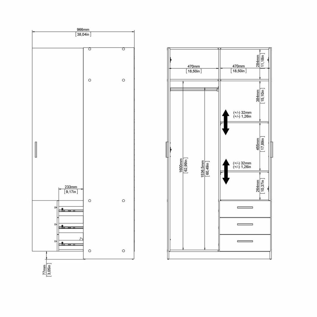 A masszív fa váz biztosítja a szekrény tartósságát és stabilitását, miközben a könnyen kezelhető felület révén egyszerű az ápolása. A három fiók és az állítható polcok lehetővé teszik, hogy személyre szabja a belső elrendezést, így minden apróságnak, kiegészítőnek is helyet talál.